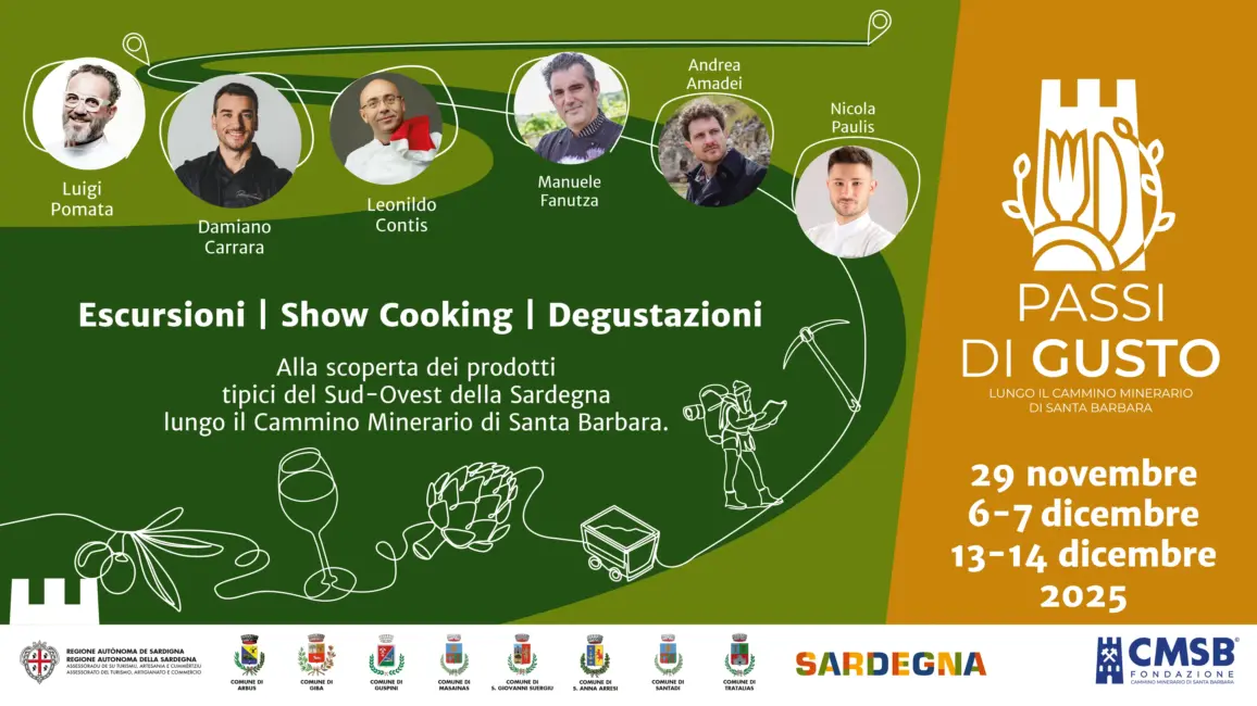 Il progetto “Passi di Gusto” unisce l'attività fisica e l'immersione nel paesaggio minerario sardo con l'arte culinaria. Lungo i sentieri che attraversano località storiche e naturalistiche come Santadi, Montevecchio, Masainas, Sant’Anna Arresi e San Giovanni Suergiu, i partecipanti potranno godere di: escursioni guidate assaporando la natura e le tradizioni più vere, laboratori gastronomici e show Cooking con la partecipazione di grandi chef sardi e nazionali.